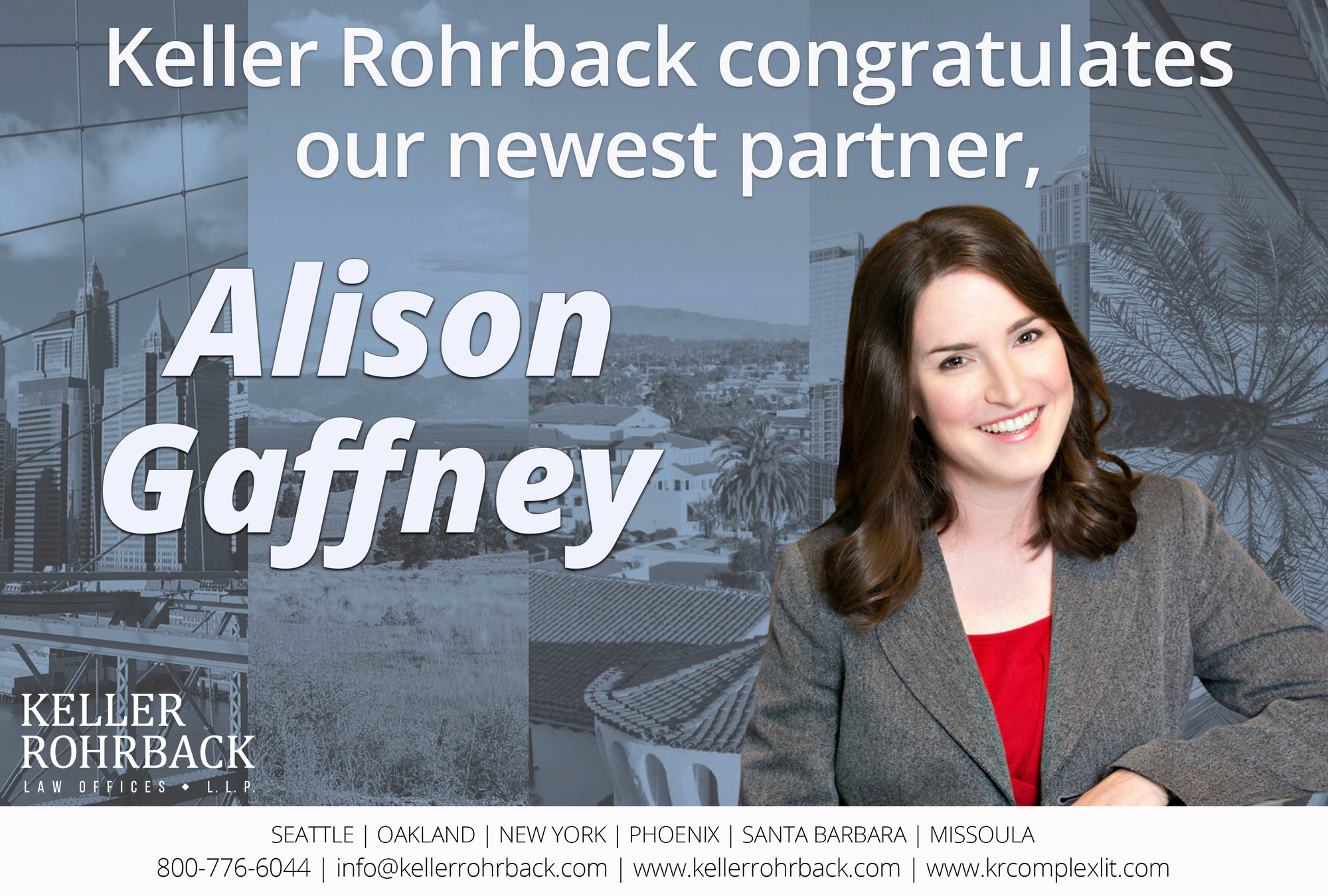 Keller Rohrback is proud to announce that Alison Gaffney has been named our newest partner, effective April 1, 2021.