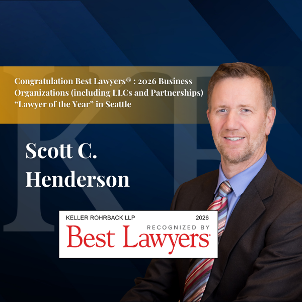 Earning recognition from his peers, Keller Rohrback partner, Scott C. Henderson, has been named by Best Lawyers® as the 2026 Business Organizations (including LLCs and Partnerships) “Lawyer of the Year” award winner in Seattle.