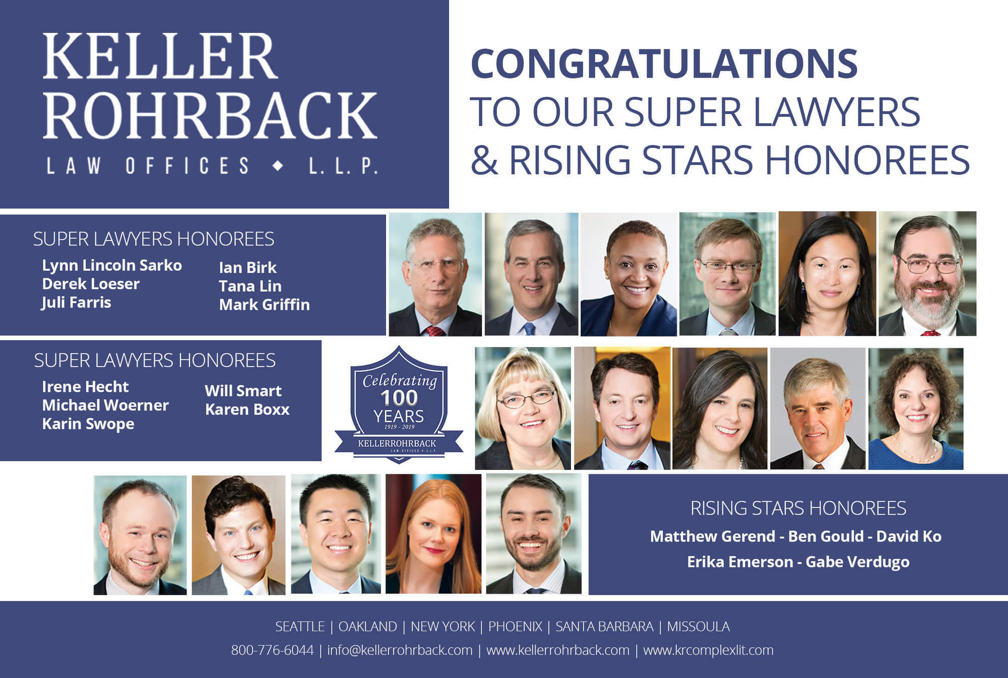 Keller Rohrback congratulates 16 of its attorneys for being named to the 2019 Washington Super Lawyers and Rising Stars lists. Super Lawyers is a rating service for attorneys who have attained a high degree of peer recognition and professional success. Honorees are nominated, independently researched, and then evaluated by a committee of peers. No more than 5% of attorneys in each state are selected.